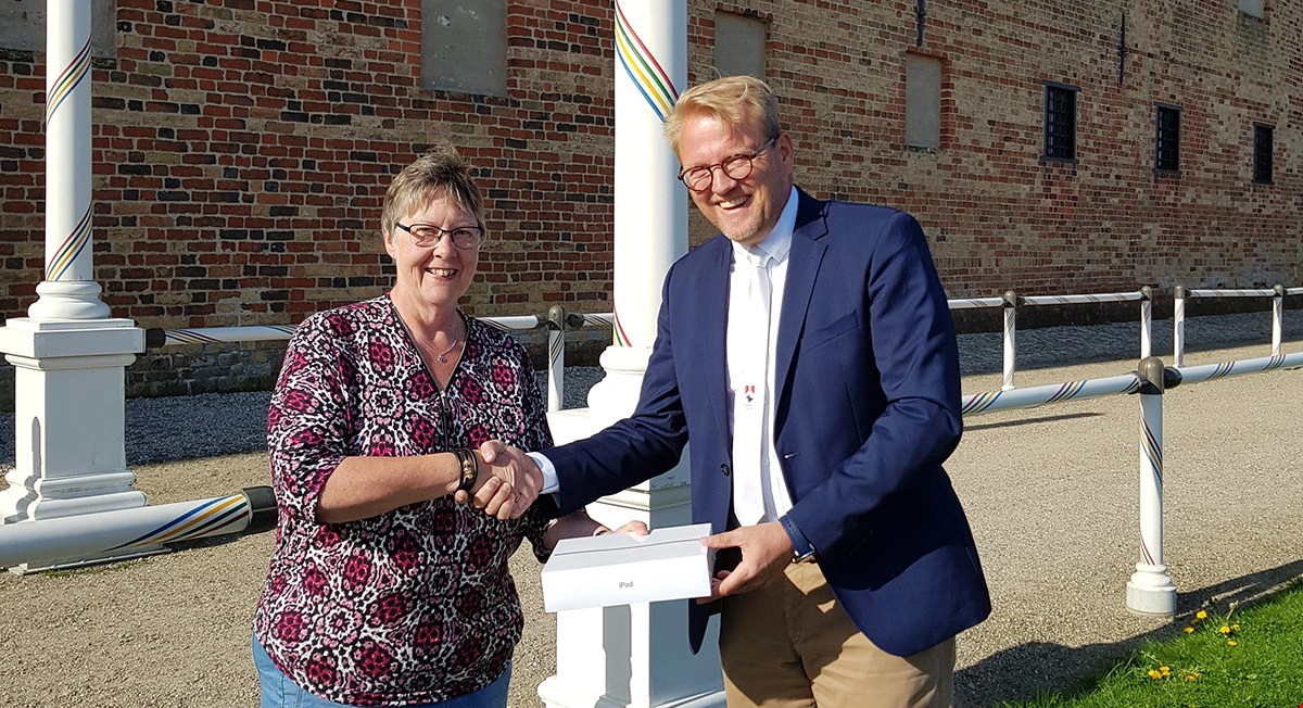 Det var medlem af Arrangementskomiteen, privatkundechef i Kreditbanken i Sønderborg, Bjarne Mortensen, der overrakte iPad’en til en glad Grethe.
